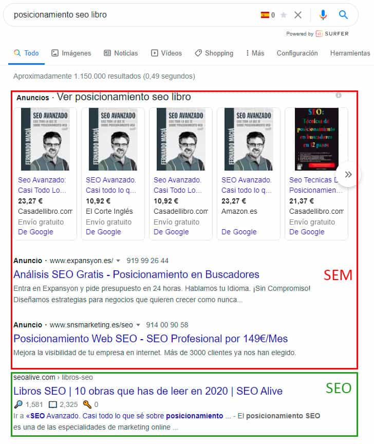 En la siguiente foto podéis ver un ejemplo de cómo se ve en el buscador los resultados SEM (recuadro rojo) y los SEO (recuadro verde). Como se puede apreciar, los resultados SEM están marcados como “Anuncios” mientras que los SEO no tienen ninguna etiqueta y están justo después de los anuncios de pago.